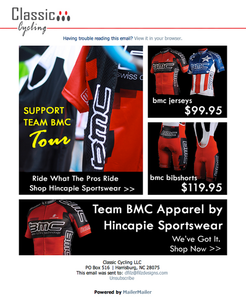 Classic Cycling retails several varied name-brand apparel and cycling gear to their customers, including their own label's merchandise. Continuous sales from each brand required an individual design for email campaigns and online ads.